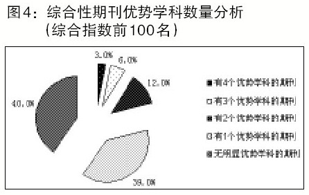 然而,如图4所示,目前综合指数排名前100名的大部分综合性期刊只有1个优势学科或在各学科中都未形成明显优势;与2010年度相比,具有多个学科优势的综合性期刊的数量略有减少。这说明,综合性期刊的“学科优势”很难保持,且这一趋势与综合性期刊总体优势的下降是一致的。据2011年度《复印报刊资料》的转载数据统计显示,综合性期刊的总体优势在弱化。在2011年度被《复印报刊资料》转载论文的全部期刊中,综合性期刊为582种,共被转载论文5098篇,平均每种期刊被转载8.8篇,低于2010年度平均每种期刊被转载9.9篇的数据。
