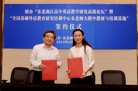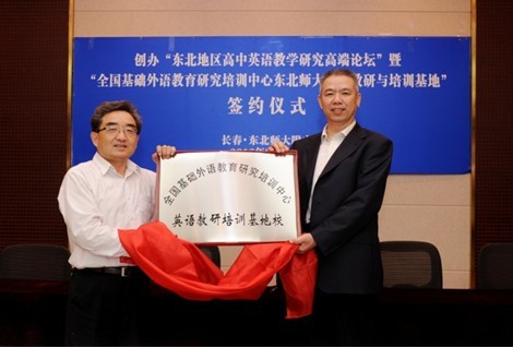 随后,张连仲教授与东北师大附中刘丽君副校长分别代表中心和东北师大附中签订了相关协议,“全国基础外语教育研究培训中心东北师大附中英语教研和培训基地学校”授权及揭牌仪式隆重举行。 接着,“‘一条龙’外语教育模式研究”子课题——关于高中英语优效教学的实践研究”开题报告会正式开始。“‘一条龙’外语教育模式研究”是全国教育科学“十二五”规划教育部重点课题,该课题的组织实施工作由全国基础外语教育研究培训中心承担,张连仲教授担任“关于高中英语优效教学的实践研究”子课题的指导专家。东北师大附中英语教研室作为中心的试验基地将在中心专家的指导下,由东北师大附中英语教研室孙大伟主任负责并组织团队承担课题的具体试验,通过对高中英语教学内容的阶段性划分及阶段性教学任务的细化,探索不同学段的优效课堂教学模式。 在开题报告会上,东北师大附中的牟忠彦、张影、原悦、曹进、师雅巍、韩玲老师以及长春市实验中学的潘晓旭老师分别以《高中英语课本同步练习与评价的优化》、《高中英语阅读教学模式的实验研究》、《高中英语教材内部整合及弹性开发利用》、《基于课堂观察的常规教学反思》、《高中英语读写教学策略研究》、《高中英语课堂观察工具的设计与使用》和《高中英语词汇记忆优效策略的实践研究》为题进行了分课题首批开题报告。张连仲教授肯定了教师们积极投入教研的精神并对教师们的课题设计一一提出了宝贵意见和建议。会后,在孙大伟主任的带领下,课题组全体成员根据专家的意见,对课题开题报告及其他有关内容进行了调整和修改,并决定在今年6月正式开始运行课题的各项工作。 据介绍,东北师范大学附属中学英语教研室是吉林省教育厅、长春市教育局学科教研基地和学科教学示范单位,其优异的教学质量和丰硕的研究成果在长春市乃至吉林省均发挥着示范和引领作用,在东北地区和全国产生了较大影响。对于此次成为中心的“基础英语教研与培训基地”,孙大伟主任表示,这将进一步促进该校英语教研室在“十二五”期间实现更快更好的发展,使学校英语学科建设和教研工作再上一个新的台阶。“我们将在中心指导下进一步开展校本学科建设与教师专业发展工作,构建中心和学校的有效合作模式,实现‘研培结合、资源共享、优势互补’,基地校的落成必将为师大附中的英语教研室以及英语教学教研发展提供更加广阔的平台。”孙大伟主任说道。 据了解,基地落成以后,中心将为东北师大附中英语学科建设和发展提供调研,并帮助其制定发展规划;参与并指导东北师大附中英语学科的教学研究,提供申请中心研究课题的论证和立项等优先支持;有计划、阶段性地为东北师大附中培训优秀英语教师,提供教师参与和参加中心各级各类教研活动的机会和平台;促进东北师大附中教师专业化发展并指导东北师大附中英语名师工作室的建设与发展。 东北师大附中则将承接中心的课题研究项目,为中心的教研和培训活动提供优质典型观摩课、教学录像等教学研究案例,根据学校实际为中心在东北地区乃至全国的教师及教材培训工作提供专家和优秀培训教师,并为中心在当地的教研和培训活动提供力所能及的便利条件。
