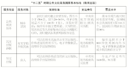 7月20日,国务院《国家基本公共服务体系“十二五”规划》正式公布,这是我国首部基本公共服务规划。规划明确提出,国家要建立公共文化服务制度,保障人民群众看电视、听广播、读书看报、进行公共文化鉴赏、参加大众文化活动等权益。