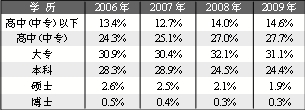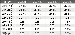 高中以下学历读者比例增长1.3%,25~38岁读者比例增长2%,可能与家电下乡政策有关。家电下乡政策促进了农村电脑设备的普及,降低了农村地区使用电脑的成本,青壮年农民以及农村学生接受能力强,是家电下乡产品的主要购买者,也促成了2009年电子图书读者新的增长点。