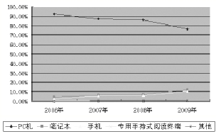 电子图书阅读终端主要包括PC机、笔记本、手机、专用手持式电子图书阅读终端。按类别划分,手机作为阅读终端的使用率上升明显,2006~2009年,手机的使用率均增长了8%。(见图2)