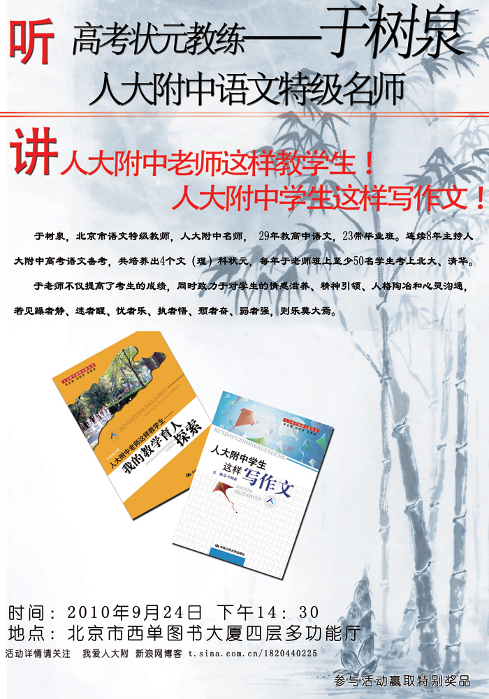 中国人民大学出版社将于2010.9.24在北京市西单图书大厦举行《人大附中老师这样教学生》《人大附中学生这样写作文》新书签售活动,届时,人大附中语文特级名师于树泉老师现场讲座。