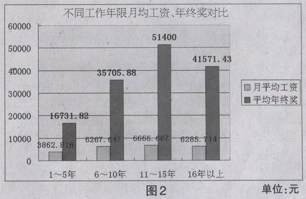 以工作年限进行分段调查,1~5年工龄从业者月均工资约为3862.82元,年终奖约为1.67万元,略低于2010年调查结果;6~10年工龄月均工资约为6267.65元,年终奖约为3.57万元,均比去年有较大增长;11~15年月均工资约为6666.67元,年终奖为5.14万元,与去年同比也有大幅增长;16年以上者,月均工资约为6285.71元,年终奖约为4.16万元,月均工资低于去年,但年终奖相仿。可以说,这一调查结果在一定程度上符合预想,即工作资历和经验会给从业者的薪酬增加一定筹码:与去年不同的是,去年是在6~10年、11~15年两个区间段的年终奖上出现了前者高于后者的情况,此次是16年以上这个区间段的月均工资和年终奖均低于11~15年区间段。有业内人士表示,这当中既有本次调查的样本分布因素,也有转企改制后越来越多的出版企业采取绩效考核等原因。(见图2)