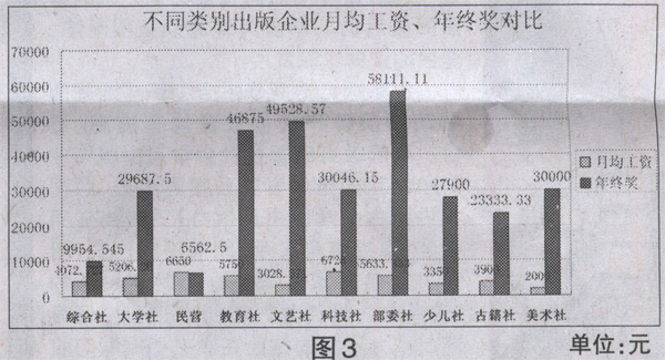 而从出版企业的类别来看,此次调查结果显示,月均工资较多的是科技社、民营公司和部委社,分别是6728元、6650元和5633.33元;接下来是教育社、大学社和综合社,分别是5750元、5206.26元和4072.73元;相比较而言,古籍社、少儿社、文艺社和美术社则略逊一筹,依次是390O元、3350元、3028.57元和2000元,这当中比较出乎意料的是,教育社和少儿社的待遇与当前图书市场表现有出入,而民营公司的收入较高主要是调查对象岗位较高所致。不过,如果综合年终奖等待遇来看,部委社、文艺社和教育社还是属于待遇较高的出版企业,其年终奖分别约为5.81万元、4.95万元、4.69万元;科技社、美术社、大学社、少儿社和古籍社则多为2~3万元,综合社和民营公司在年终奖这个层面就显得有些差强人意,均不足万元。(见图3)