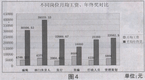 当然,不同的岗位也会有不同的待遇,除了此次受访的美编待遇较高外,部门负责人、营销策划和编辑的整体待遇都相对突出,月均工资分别是6375元、5800元和4749.22元;年终奖分别是3.93万元、2.36万元和3.05万元,行政人员和发行人员的月均工资和年终奖也基本相当,分别为4220元、2.22万元和3966.67元、2.27万元。结果表明,编辑平时的工资并不突出,但到年底,所策划图书就业绩而来的年终奖尽管不能完全代表其付出,但在一定程度上得到了平衡。(见图4)