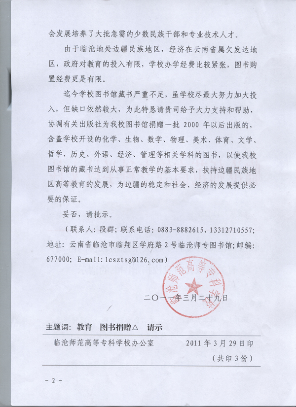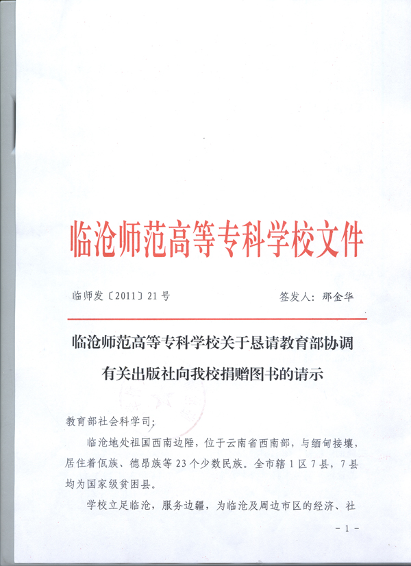 临沧师范高等专科学校关于恳请教育部协调有关出版社向我校捐赠图书的请示 - 大学出版社捐赠专栏 - 中国高校教材图书网