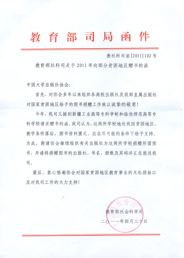 教育部社科司关于2011年向部分贫困地区赠书的函 - 大学出版社捐赠专栏 - 中国高校教材图书网