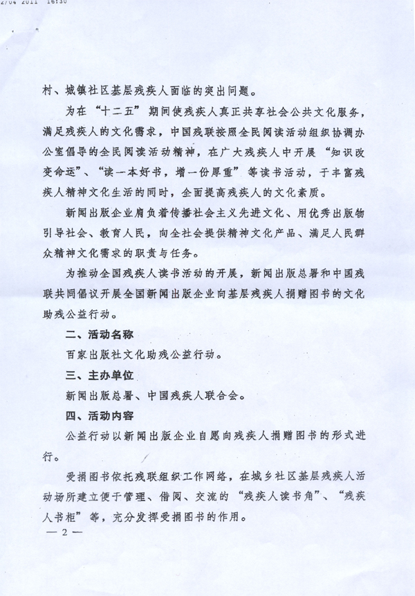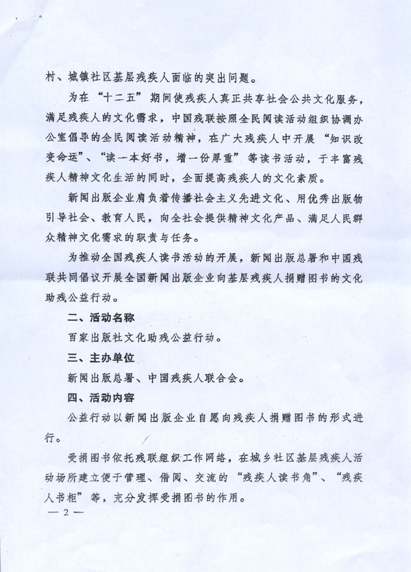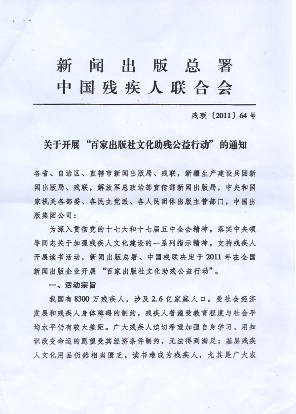 新闻出版总署中国残疾人联合会关于开展“百家出版社文化助残公益行动”的