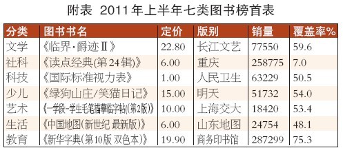 2011年上半年,文学类图书市场竞争激烈,各路英雄豪杰齐聚。排在第一的是郭敬明的《临界·爵迹Ⅱ》,该书上半年合计监测销量为77550册;他的另外两部作品分别是排在第三的《临界·爵迹Ⅰ》和第六的《爵迹·燃魂书》,也表现突出。位列第二的是央视名嘴白岩松的《幸福了吗》,是“不惑”而“惑”的白岩松又一次对人生的思考,上半年销量近5万册。金一南的《苦难辉煌》同样引人注目,排在第四的位置,在恰逢中国共产党建党90周年之际品读该书,无疑是一种激励和鼓舞。村上春树的“1Q84”系列上半年亦有2本入围10强,该系列在整个日本、东亚乃至全球都引起巨大的反响。就图书销售均价而言,文学类TOP100均价为30.89元。