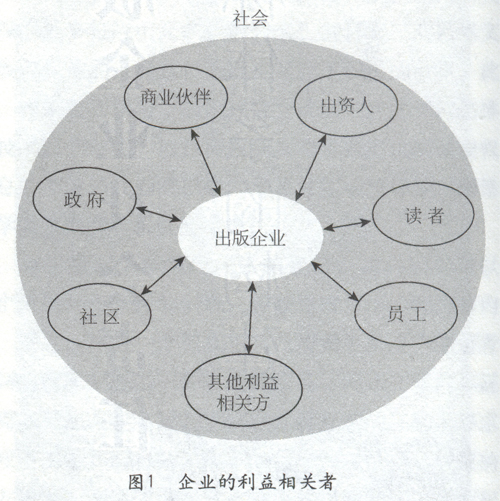 二、出版企业社会责任指标体系的构建方法 构建社会责任指标体系首先需要明确各级指标的选择与设计应遵循什么样的逻辑框架。构建社会责任指标体系通常可以采取利益相关者维度、内容维度、功能维度、组织层级维度、作用属性维度五维逻辑框架模型。不同的逻辑框架将形成不同的指标体系,不同的设计维度也将导致不同的指标体系。例如,按照利益相关者(Stakeholder)维度,社会责任指标体系的一级指标将划分为投资者责任、客户责任、员工责任、商业伙伴责任等;而按社会责任的内容维度,则一级指标将划分为经济责任、法规责任、文化建设责任、伦理道德责任、社会公益责任等。 这里,我们遵循一级指标——二级指标——三级指标的构建思路来构建出版企业社会责任指标体系。其中,一级指标采用利益相关者维度来设计相关指标;二级指标采用内容维度来设计相应指标;三级指标采用作用属性维度来设计相应指标。 由于我们是采用利益相关者维度来设计出版企业社会责任的一级指标,因此,其关键是首先要确定出版企业的利益相关方以及其对出版企业社会责任的具体要求。 所谓利益相关者,是指能够影响或者改变企业的目标,或者受到企业实现其目标过程影响的个人或群体。根据利益相关者的定义,结合我国出版业的实际,我们将出版企业的利益相关者图示如下。