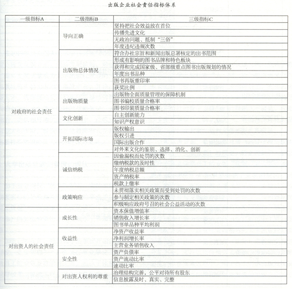 企业社会责任(Corporate Social Res-ponsibility,CSR)是企业在某特定社会发展时期,为实现自身与社会的可持续发展,以股东和各利益相关者对企业良性行为的期望而形成的经济、法规、伦理道德、社会公益等行为责任。出版企业除应该承担起一般企业的社会责任外,还要承担起更多的社会责任,比如文化建设与传播责任等。出版企业社会责任指标体系是指为反映和衡量出版企业整体、内部组织和员工个人履行社会责任的行为和效果而设置的依据或标准体系,它由一系列相互联系、相互制约的指标组成的科学的、有机的整体。建立出版企业社会责任指标体系,对我国出版企业的社会责任水平进行有效的、准确的评价,能够有效地引导我国出版企业履行社会责任。