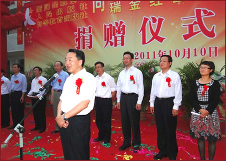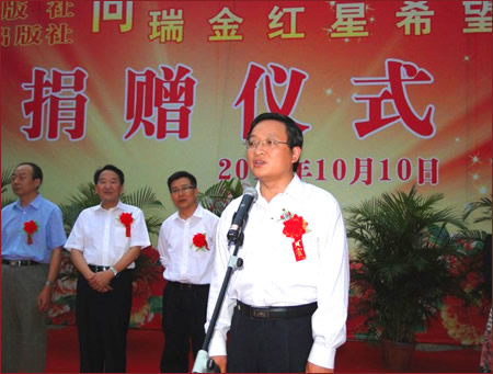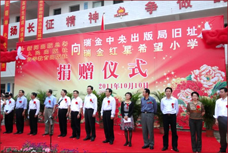 蒋建国副署长在捐赠仪式上指出,红都瑞金是中华苏维埃共和国临时中央政府的诞生地,红都人民为了中国革命,作出了巨大的牺牲和贡献。全国新闻出版系统心系老区,关爱红都,关注教育,对瑞金老区的人民有着深情厚意。早在6年前,新闻出版总署、高等教育出版社就开始援建中央出版局旧址和红星希望小学。