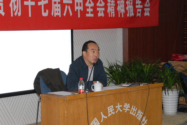 为了积极响应李长春同志 “广泛深入宣讲十七届六中全会精神,推动兴起学习宣传贯彻全会精神热潮”的倡议,11月3日,应中国人民大学出版社领导邀请,中宣部出版局郭义强局长来到人大出版社,为各位党员干部及时传达了十七届六中全会的会议精神,并结合出版业解释了与其直接相关的决定内容。