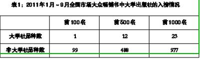 1.重在专业化,大众图书作补充 立足传播学术思想成果、引领科研创新的出版本职,大学出版社群体已经日益成为集教育与专业出版于一体的综合机构,他们始终坚守专业化的经营道路,着重在学科特色和学术水平上下工夫。同时,已经有越来越多的大学出版社参与到市场成长性较好的大众市场竞争中来,力求在市场的快速增长中分得一杯羹,部分大学出版社结合自身能力和内外部资源已开始拓展大众阅读板块。 从今年前三季度开卷不同层次大众畅销书排行榜来看(见表1),在畅销书排行榜前1000名中,大学出版社共占据23个席位,其中有12个品种进入前500名,并在前100名中谋得一席,从而打破了前几年大学出版社在大众畅销书中入榜品种数为零的局面。