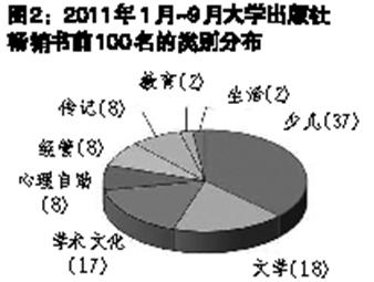 少儿类图书是近5年来我国图书零售市场中极具活力的一个出版领域,同时是推动整体图书零售市场向上的重要力量。近年来,在小读者们阅读的强烈渴望下,在作者群体与出版者对少儿类图书的用心创作和精心培育下,少儿类图书市场已涌现出一批经久不衰的常销品种和形式多样的展现题材。在这一领域当中虽然大学出版社目前的实力还与专业的少儿出版社存在差距,但是大学出版社也已经开始显现出自己的实力,比如南京大学出版社的《银河动漫精品书系》就是大学出版社探索少儿动漫题材的成功代表。 而文学类图书以其广泛的阅读群体和较低的出版门槛,历来是诸多出版社进入大众阅读市场的首选板块。同时,文学类图书也是活力无限的一个出版领域,不断涌现的热点题材、层出不穷的作者和作品为广大出版者提供了大量的选题空间。在这一领域当中,以陕西师范大学和广西师范大学为代表的大学出版社依托职场小说或者名家经典图书已经取得了突出成绩。 相较之下,学术文化类图书兼具专业性与大众性,可谓是大学出版社的先天优势板块,因此他们在学术文化板块的表现也更为突出。目前,大学出版社出版的畅销书中来自于这个板块的也比较多:2011年前三季度大学出版社大众畅销书排行榜前10名中,学术文化类图书即占据半数席位。 此外,近几年心理自助类图书也是颇为热门的细分门类,尽管大学出版社对这一板块较少涉足,但仍然推出了具有影响力的畅销作品,例如陕西师范大学出版社引进《不抱怨的世界》系列图书,可见优秀的引进版图书也开始成为大学出版社切入非传统优势领域的可选路径。