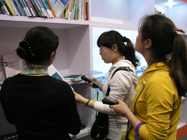 新华书店正在用数据扫描器现场采购教材 - 出版动态 - 中国高校教材图书网