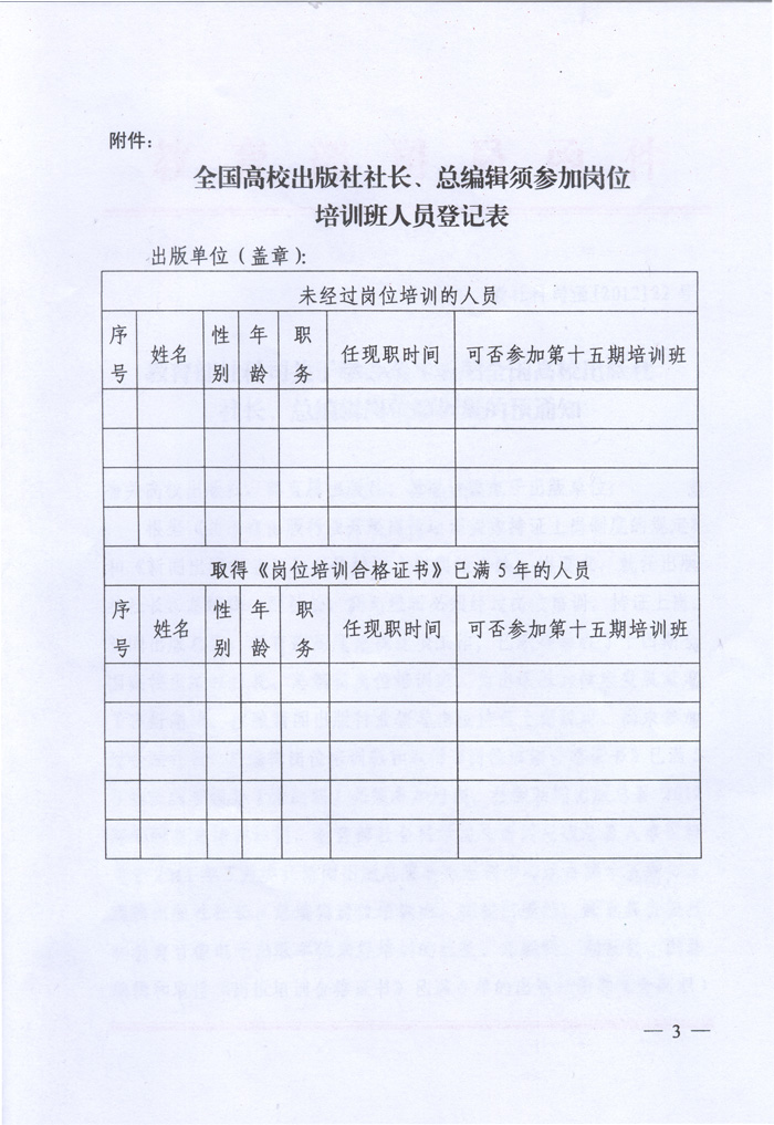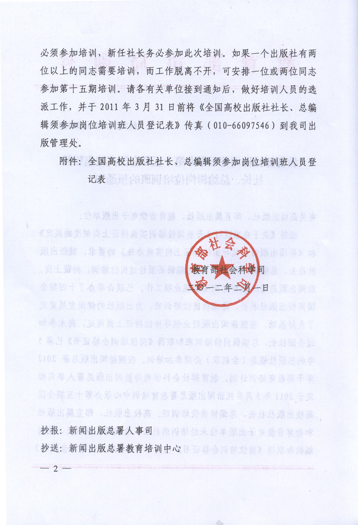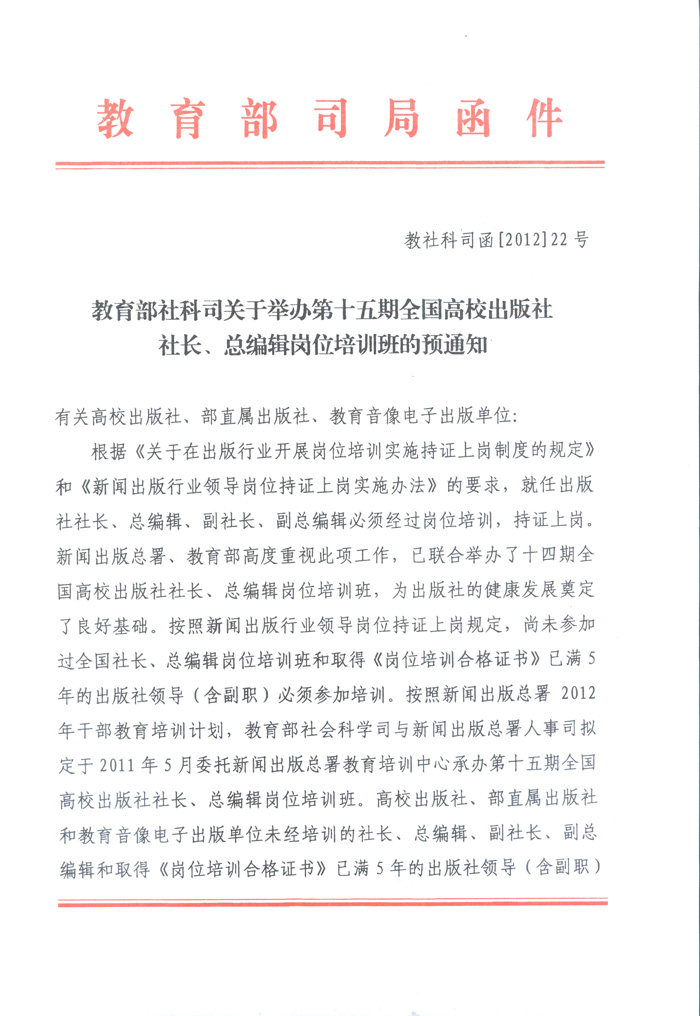 教育部社科司关于举办第十五期全国高校出版社社长、总编辑岗位培训班的预通知
