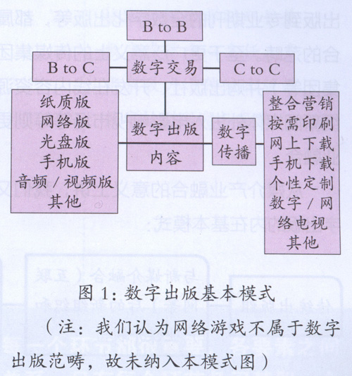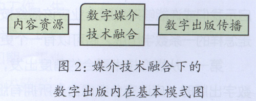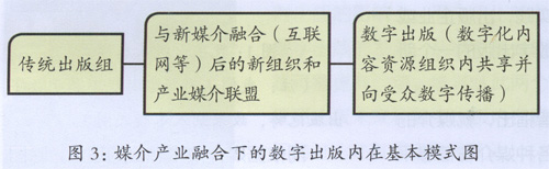 而媒介的产业融合则指的是一个传媒公司或集团同时拥有报刊、广播、电视、互联网等多种媒介形式和媒体组织,也可以指传统媒介之间的联合。媒介的产业融合主要表现在以报纸、广播、电视为代表的传统媒介与以互联网、手机为代表的新媒介之间的融合上。传播学界对媒介产业融合的这个定义很有意思地将图书期刊这些媒介排除在外,但我们在这里则必须将它们纳入讨论范围。 按照媒介产业融合的基本理念,数字出版产业实际上可以进一步被看做是不同媒介产业融合的结果,它既可以被视作是多种数字媒介形式和数字出版组织企业的经营模式,又可以被视作为出版内容在传统纸质媒介与互联网等新媒介等融合后的呈现形式。比如,贝塔斯曼集团将传统的图书、杂志、音乐音频视频(磁带、CD、录像带、DVD等产品)等产品内容转移到互联网,搭建起多媒体平台,实现其跨媒体战略。而其跨媒体战略最终的表现就是传统出版和数字出版的融合。又比如,以网络图书销售起步的亚马逊经过若干年的整合,逐步实现了数字平台和内容资源、在线出版、内容与终端阅读器、实体图书销售与数字内容销售等新媒体环境下的传统图书销售、新媒体硬件设备销售与数字内容出版的融合。还有,像爱思唯尔集团的纸质专业期刊出版到纸质专业期刊出版跟数字内容语料库出版到专业期刊的全数字化出版等,都属于数字化媒介产业融合的范畴。至于更广泛意义上的传媒集团(比如澳大利亚新闻集团等)并购出版社、开发在线内容资源平台、除了原有的报纸新闻媒体外进入电影电视市场等等则更是典型意义的媒介产业融合。 从媒介产业融合的意义上讲,我们又可以用下图来表示数字出版的内在基本模式:
