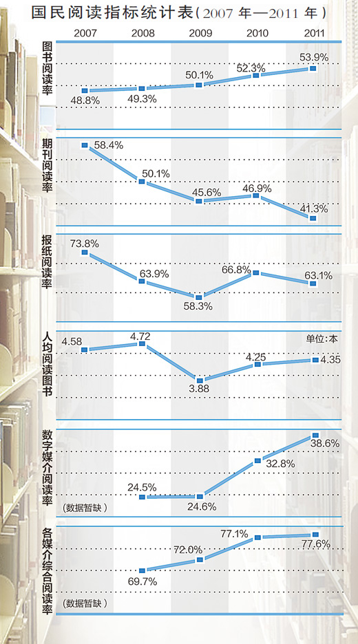 国民总体能承受的图书价格略有提高,图书阅读率连续4年增长 调查显示,我国国民对图书的价格承受能力均有所增加。对于购买一本200页左右的文学类简装书,国民能够接受的平均价格为13.43元,比2010年增加了0.68元。 调查显示,2011年我国国民包括书报刊和数字出版物在内的各种媒介的综合阅读率为77.6%,比2010年增加0.5个百分点。其中,图书阅读率为53.9%,较上年增加了1.6个百分点,连续第四年增长;报纸阅读率为63.1%、期刊阅读率为41.3%,分别较上年下降3.7和5.6个百分点。 从对传统纸质出版物阅读量的考察来看,2011年我国国民人均阅读图书、报纸和期刊分别为4.35本、100.70期(份)、6.67期(份)。除纸质图书阅读量外,本次调查还考察了国民对电子书的阅读数量。结果显示,2011年我国国民人均阅读电子书1.42本。 中国新闻出版研究院院长、首席研究员郝振省分析,传统纸质图书的阅读率和阅读量双双上升,虽然幅度不是很大,但至少说明,传统阅读方式仍占重要地位。他说,我国的情况和发达国家不同,广大农村地区人口和城市中老年人口对传统纸质图书的阅读仍有很深的感情和牢固的习惯,随着生活水平的提高和寿命的提升,传统阅读仍有发展空间。 对于报刊阅读率下降的问题,徐升国认为,虽不能简单地得出报刊衰落的结论,但报刊的确首当其冲地受到了数字化媒体的冲击。他说,报刊本身就是短平快的阅读材料,与更加碎片化和快速的数字化媒体有所重叠,因此容易受到影响。媒体做的是内容,载体形式的变化对于传统媒体其实是一次机遇,比如在苹果的iPad流行后,许多国内的期刊都推出了客户端,这是媒体适应数字化挑战的主动应对。