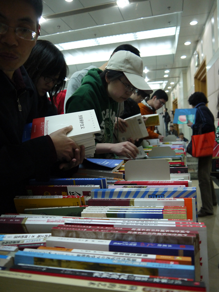 为迎接世界读书日的到来,4月21日上午,人大出版社作为“第二届北京换书大集”的特别支持单位,来到了首都图书馆多功能厅。此次活动,人大社共捐书567种,1500余册,价值近4.7万元。 周六虽然天气阴霾,但丝毫没有影响读者们换书的热情。一大早就有许多读者手持换书券排队等候入场。因为换书读者较多,首图采取了分批入场挑选图书的政策。