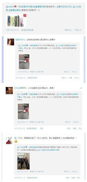 换书现场气氛热烈,几小时之内,人大社的图书就找到了新的读者,很多读者希望人大社每年都能参加,为大家带来更多更好的书籍。活动结束后,部分读者在微博晒出了换到的人大社图书,人大社此次换书活动得到了许多网友的支持和赞扬。