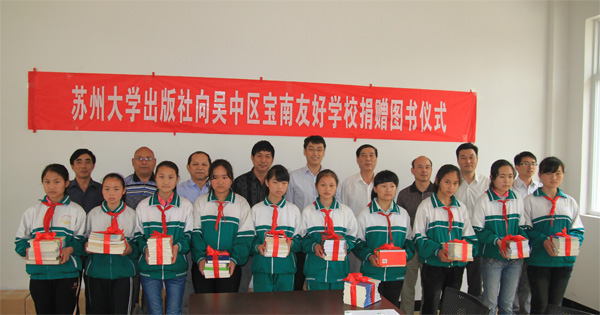 2012年5月9日,苏州大学出版社向苏州市吴中区宝南友好学校捐赠图书仪式在宝南友好学校举行。群团与直属单位党工委书记蒋剑平,出版社长张建初、副总编辑兼党支部书记朱坤泉,吴中区教育局教研员张海龙,宝南友好学校校长权桂良以及群团与直属单位党工委、出版社的部分党员和宝南友好学校的部分师生参加了捐赠仪式。 捐赠仪式由权桂良校长主持。张建初社长向宝南友好学校的师生简单介绍了苏州大学出版社的情况,并表示作为一家文化出版企业,苏大社在传承先进文化、做好图书出版的同时,始终不忘社会责任,积极投身社会公益事业,先后向江苏、青海、西藏、云南、贵州等省份的农家书屋、大中小学图书馆等捐赠了大批图书。本次捐赠的图书都是出版社精心挑选的适合中小学生阅读的图书,部分图书是出版社党员和职工自发捐赠的。希望这批图书不仅能丰富学校图书馆馆藏,还能充实学生课余文化生活,为学生学习、生活、心理健康提供有益的指导和帮助。蒋剑平书记在发言中对图书捐赠活动给予充分肯定,认为出版社在“创先争优”活动中积极发扬党员创先进、争优秀、做表率的先锋模范精神,努力创新活动形式,积极服务社会,取得了良好效果。张海龙教研员代表吴中区教育局对苏大社的捐赠活动表示感谢,并表示作为以农民工等弱者群体子女为主要生源的学校,希望得到社会更多的关爱与支持。 张建初社长表示,今后出版社将与宝南友好学校加强沟通与交流,以更多的实际行动支持学校教育事业蓬勃发展。 会上,蒋剑平书记、张建初社长等代表出版社向学校师生代表捐赠图书近700余册,价值12000余元。来源:苏州大学出版社
