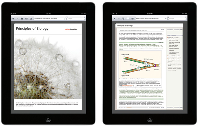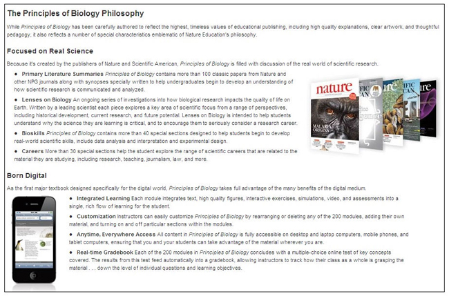 自然出版集团的大学数字教材《生物学原理》自宣布推出至今已经一年了,从去年9月份正式发布到现在不足一年,已有超过100所学校选用了它。