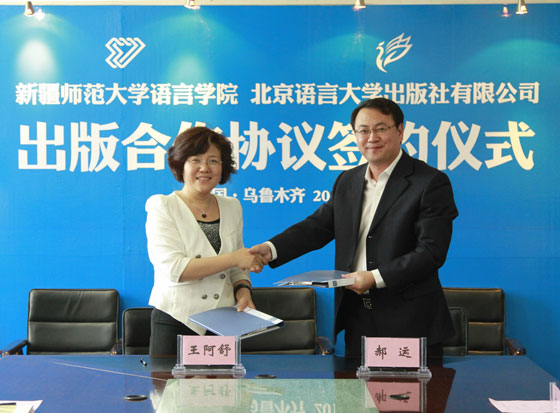 6月18日,在新疆师范大学中国语言学院的四楼会议室,北语社与新疆师范大学中国语言学院签署了《出版合作协议》。新疆师范大学中国语言学院王阿舒院长介绍了学院作为自治区双语教学研究基地的建设情况,阐述了双方合作的领域。郝运社长指出,双方合作具有重大的战略意义,是双方促进双语教育事业发展的重要举措,表示将大力支持基地教材研发和学术出版等工作。 据悉,北语社今后将与新疆师范大学优势互补,资源共享,在双语教材研发出版、教师培训、教学研究等领域广泛开展合作。