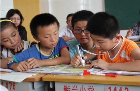 小学生饶有兴趣的使用外研通点读笔学习