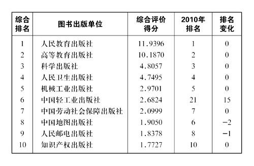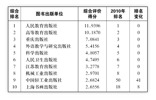 据《中国新闻出版报》7月11日报道,经过近10个月紧张而有序的工作,新闻出版总署于7月9日发布《2011年新闻出版产业分析报告》。《报告》本着严谨、客观、求实、创新的原则,通过历史与现状的对比,从宏观和微观两个层面入手,全面深入地分析了2011年新闻出版产业的发展状况。 其中,《报告》认为全国图书出版单位经济规模整体看好,并选取图书出版单位财务报表中的主营业务收入、资产总额、所有者权益和利润总额4项经济规模指标,采用主成分分析法,对全国550家图书出版单位的总体经济规模进行综合评价。在《全部图书出版单位总体经济规模综合评价》和《中央各部门各单位图书出版社总体经济规模综合评价》两项评价中,人民教育出版社均以得到“11.9396”的综合评价分数,继2010年后蝉联榜首。 (说明:下表中综合评价得分系选取主营业务收入、资产总额、所有者权益和利润总额4项经济规模指标,采用主成分分析法通过spss直接计算所得,仅用来显示各单位的相对位置。)