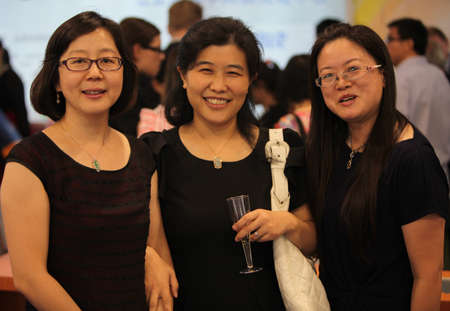 外研社副社长王芳与HMH中国区代表赵东泓(左)、 圣智学习出版公司中国区高级客户经理郭彦(右)