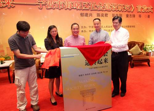 9月18日上午,由中国人民大学出版社隆重推出的服务型政府大视野丛书之一的《让社会运转起来——宁波市海曙区社会建设研究》一书,在宁波市海曙区举行了盛大的首发式。浙江省民政厅副厅长梁星心、宁波市副市长陈奕君、宁波市海曙区区委书记彭朱刚、浙江大学党委副书记邹晓东、浙江大学公共管理学院副院长郁建兴以及来自中央编译局、清华大学的专家学者出席了首发式。