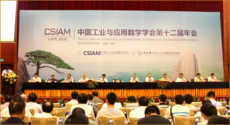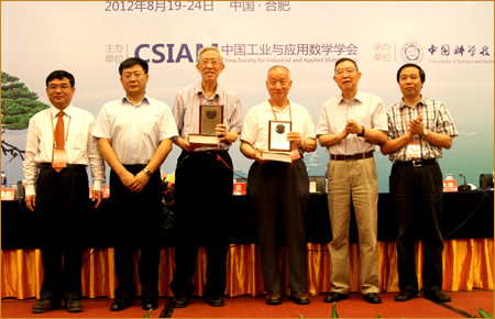 2012年8月19日,中国工业与应用数学学会第十二届年会在安徽世纪金源大饭店拉开帷幕,中国工业与应用数学学会荣誉理事长李大潜院士、理事长郭雷院士、中国科学技术大学数学学院院长马志明院士、中国科学技术大学党委书记许武教授、高等教育出版社副总编辑林金安出席开幕式及第四届“CSIAM苏步青应用数学奖”颁奖仪式。 “CSIAM苏步青应用数学奖”由中国工业与应用数学学会(CSIAM)于2003年10月设立,旨在奖励在数学对经济、科技及社会发展的应用方面作出杰出贡献的工业与应用数学工作者,鼓励和促进我国工业与应用数学工作的发展。“CSIAM苏步青应用数学奖”是目前应用数学学科在国内的最高奖项,由我社独家赞助,并连续举行四届。该奖项每两年评选一次,每次得奖者不超过两名。
