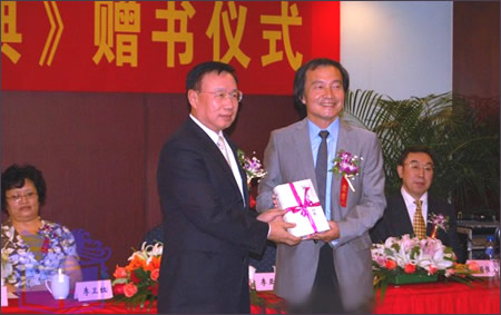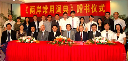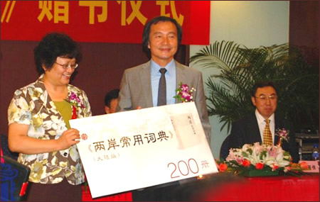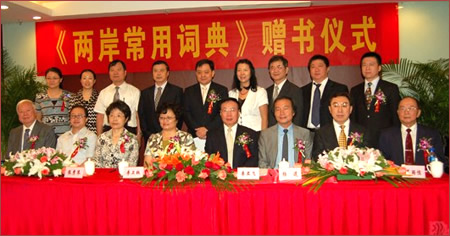 苏雨恒社长在赠书仪式上代表出版单位致辞,苏社长说:2012年7月底,在哈尔滨召开的第八届两岸经贸文化论坛上签署的《共同建议》,进一步明确了“支持两岸合编的中华语文工具书《两岸常用词典》的推广使用,加强中华语文知识库的建设。”词典出版后,我们会积极宣传,广泛销售,以便让更多的读者看到、买到、读到词典,最大限度地发挥它应有的社会价值和文化价值。