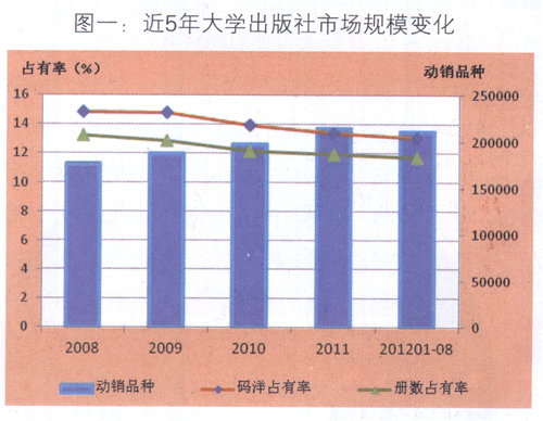 大学出版社是我国出版行业的重要组成部分,当下我国共有大学出版社100多家,占全部出版社总数的近1/5。大学出版社得益于自身优势,是传统的学术出版的重镇。近年来,伴随出版社改制转企的完成,大学出版社作为独立的竞争主体被推到市场竞争中。在竞争激烈的图书零售市场,那些较早开始关注市场、实施改革,而不仅仅依靠各种政策支持发展的大学出版社,市场表现良好;对于另一些大学出版社来说,从衣食无忧到自力更生,市场表现有待提升,因此,大学出版社须抓住机遇,在畅销书引领图书市场和产业格局的大环境下,调整思路和方法,稳中求进,有针对、有重点地开辟新的出版门类。现特就2012年1月一8月大学出版社图书零售市场现状进行简析。