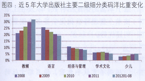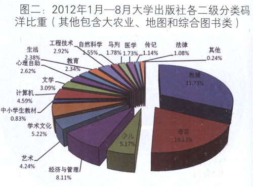 1.稳固强势板块,开拓新门类 依托高校充足的人才、智力和学术资源等先天优势,大学出版社一直以来都是学术出版的主要阵地。通过多年的积累,一些大学出版社形成独有的优势出版领域,在相关细分类市场表现出色,如在社科、科技、教辅教材和语言等主要类别的图书市场,均有大学出版社名列前茅。虽然优质专业图书的出版有助于出版社品牌的树立,但是随着出版社改制转企的成功,市场效益也成为出版社经营中重要目标之一。因此,一些大学出版社调整出版思路,一方面维持先前强势板块,争取多出高品质学术出版物;另一方面,不断开辟新市场,试水不同类别出版,攫取市场利润。 在2012年1月一8月全国大学出版社二级细分类码洋比重(图二)对比中,教辅类图书码洋比重最大,接近1/3,得益于大学出版社中的师大出版社是教辅类图书出版的主力军。语言类图书占1/5左右的码洋,其中,外语教学与研究出版社和上海外语教育出版社在这一领域具有很大优势。此外,经济与管理类、学术文化类和少儿类图书的码洋比重都在5%以上,其中少儿类很明显不是大学出版社的强势板块,在大学出版社中的码洋比重不足该类在整体市场中码洋比重(15.54%)的一半。