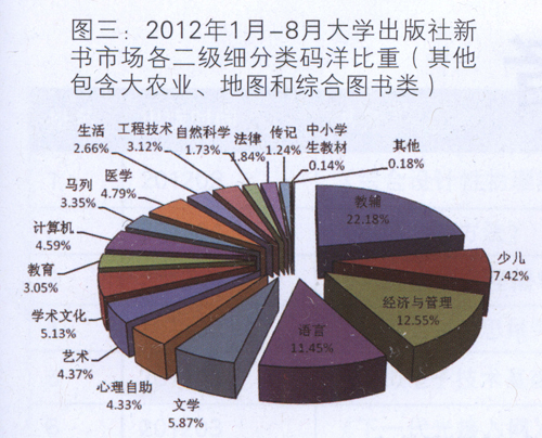 对比2012年1月-8月大学出版社新书市场各二级细分类的码洋比重(图三)可见,图二显示的整体市场码洋比重靠前的类别在新书市场也排名靠前,其中,少儿类、文学类和心理自助类图书在新书市场表现良好,尤其是文学类图书,相较于整体市场3.09%的码洋比重,新书市场份额接近6%。在新品市场中,这些并非大学出版社传统优势门类的细分类给出版社的码洋贡献十分突出。