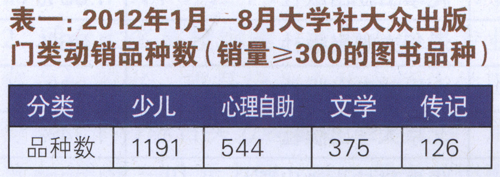在大众出版门类中,大学出版社投入也有所差别。2012年1月一8月大学出版社在大众出版主要门类的图书动销品种数(表一)显示,少儿类有1191个品种,心理自助类有544种,传记类126种。这一方面与图书类别的进入门槛高低有关,另一方面也和出版社自身的积累有关。这些信息显示,大学出版社正根据自身状况,重点投入,打造精品。