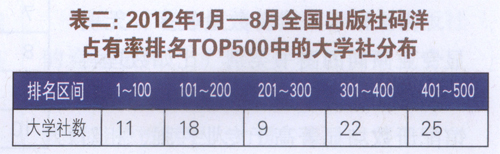 2.全国出版社排名分布 全国5 80家出版社中,在2012年1月一8月全国出版社码洋占有率排名TOP 5 00中,大学出版社共有85家(表二)。在前100名中,大学出版社有ll家。除了在第200名至第3 00名之间有9家大学出版社之外,分布基本呈现排名越靠后、出版社越多的规律。结合市场集中度情况可以看出,垄断大学出版社市场的前10家大学社,为大学出版社贡献了超过一半的码洋,在全国出版社中,这些大学出版社表现同样优秀,均排在前100名中;排名在前200名中的29家大学出版社则占大学社码洋超过80%。