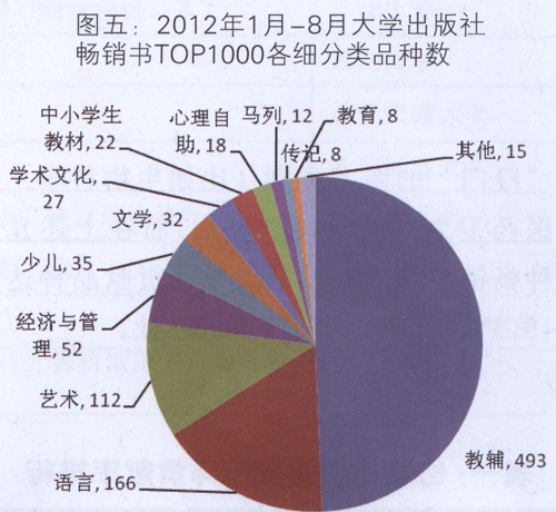 3.畅销书排行榜表现 在2012年1月一8月全国畅销书排行榜,TOPl000中,有82种来自大学出版社,但是,这些书大多为教辅教材类;而在TOPl00名中,仅有4个品种来自大学出版社。 在大学出版社畅销书排行榜TOPl000中各细分类图书品种分布(图五)中,品种数大于30的门类有教辅、语言、艺术、经管、少儿和文学类。其中,教辅类占50%左右;其他大学出版社传统优势门类,如语言、艺术和经管类均表现不俗;在大众出版门类中,少儿类有35种,文学类有32种。