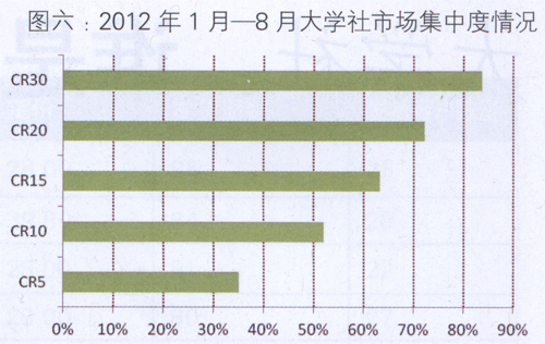 1.市场集中状况 市场集中度CRN指前n名出版社的码洋占有率之和,是反映市场份额集中程度的指标,据此可以判断市场的垄断或竞争状况。 根据2012年1月一8月全国大学出版社的市场集中情况(图六),CR5为3 5.04%,CR1O为52.02%--前1O名大学出版社的码洋占所有大学出版社码洋的一半还多。CR30接近84%,这意味着其他的70多家大学出版社仅为整体大学出版社贡献16%的码洋。由此可以看出,大学社的发展水平参差不齐,市场集中度相对较高。这既与市场领先的大学出版社在不断发展过程中,对优质出版资源的积累和掌控能力有关;也和一些大学出版社在自身传统强势出版领域的地位有关,比如理工科院校出版社在科技类、师大类出版社在教辅教材类图书市场表现优秀。