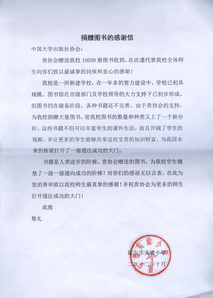延安实验小学捐赠图书的感谢信 - 大学出版社捐赠专栏 - 中国高校教材图书网