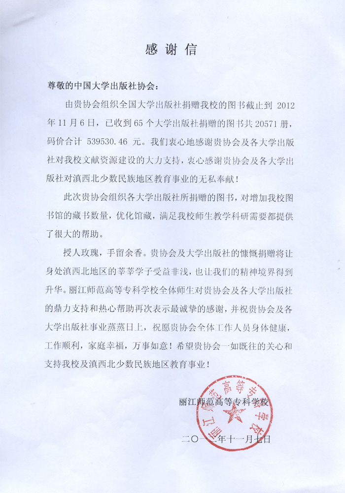 丽江师范高等专科学校感谢信 - 大学出版社捐赠专栏 - 中国高校教材图书网
