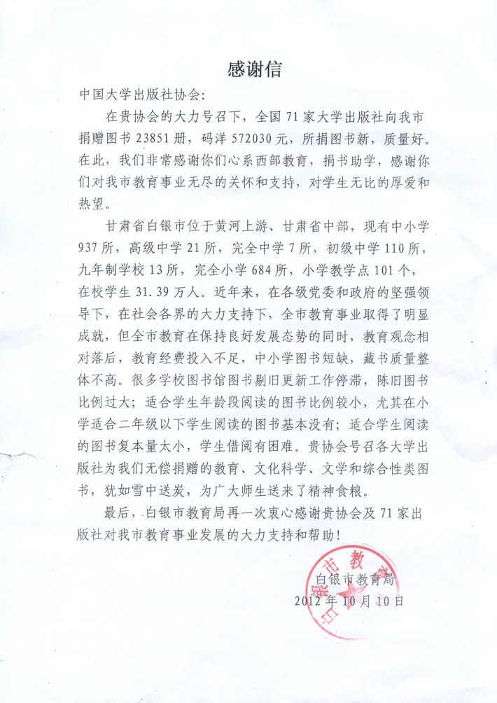 白银市教育局感谢信 - 大学出版社捐赠专栏 - 中国高校教材图书网