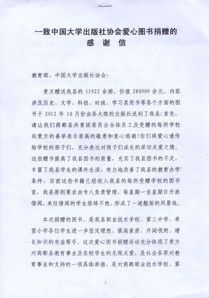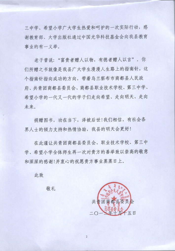 共青团商都县委员会致中国大学出版社协会爱心图书捐赠的感谢信 - 大学出版社捐赠专栏 - 中国高校教材图书网