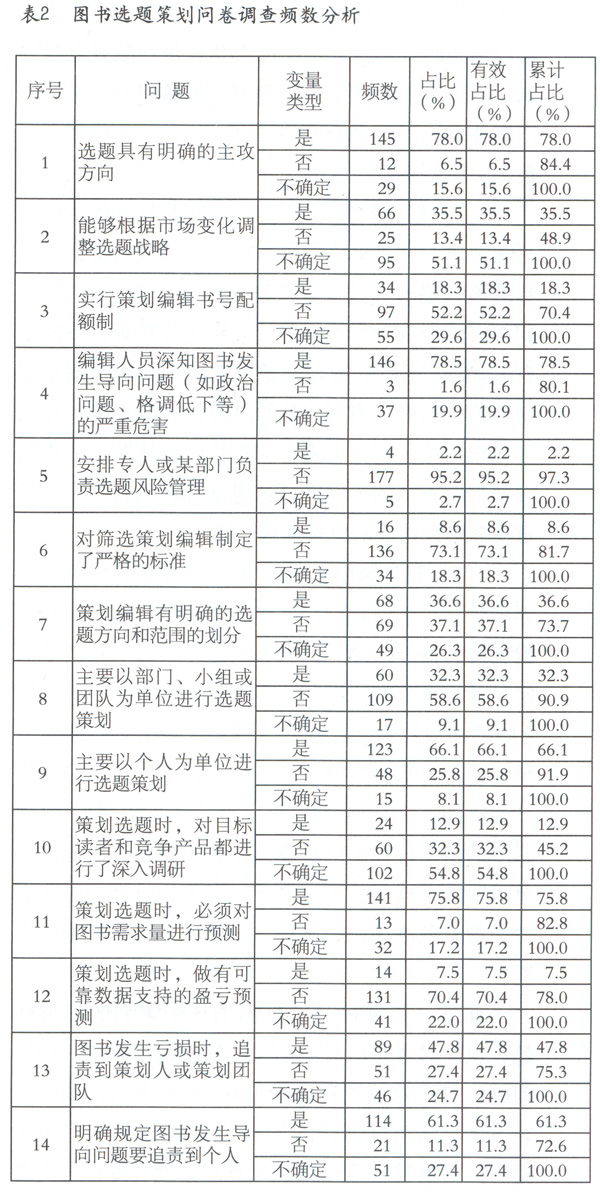 出版社是我国传统图书出版的主力军,但近些年来,在经济全球化、信息数字化等外力的冲击下,尽管采取了转企改制等应对措施,但仍然有不少出版社生存空间日益窘迫,发展状况和前景堪忧。对2005~2009年我国图书出版产业的产销存情况进行对比分析发现,图书生产品种扩张而印数下降,图书销售徘徊不前甚至是负增长,图书库存总量巨大且积压严重。①北京开卷信息技术有限公司四年来的报告分析都显示,在传统图书卖场中,月销量一册及以下的图书品种常年达到书店在架总品种数的5O%以上。以2011年以来最少102万种(2011年6月)的在架品种和最低52.24%(2012年3月)的未动销率计算,当前至少有53万种图书基本属于无效供给。②而日益膨胀的图书供给和庞大的品种堆积,使得“书业正在走向另一个极端,即从‘书荒’走向‘书殇’……近一半的图书从开印之日就注定了其‘化为纸浆’的悲惨命运,没有和读者见面就胎死腹中了。”③这无疑增加了出版资源的竞争成本,造成严重的出版内耗和浪费,使传统出版单位进一步陷入内忧外患的境况。 造成这一现状的原因是多方面的,但最主要、最根本的内因来自图书产品自身——即图书选题不当,造成图书产品无法形成有效供给。因此,亟需研究我国传统出版社选题风险管理的现状与问题,以找到症结所在和应对策略,降低图书选题失败率。 为了调查我国出版社选题风险管理现状,本研究将图书选题的实现过程分为策划、论证及实施三个阶段,并针对这三个阶段设计了46个问题,每个问题设置3个选项:“是” “不是”和“不确定”。通过对问卷进行频数分析,可以反映我国传统出版社在图书选题策划、论证和实施过程中的风险管理现状及存在的主要问题。