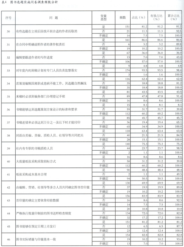 2.选题实施主要风险管理现状分析 本研究将图书选题实施阶段的风险归纳为选题夭折风险、进度风险、质量风险、成本风险和印量风险。在图书选题实施阶段的17个问题中,问题30~34调查来稿前的作者遴选和组稿活动的风险管理现状,问题35~46调查来稿后的制作和复制等活动的风险管理现状。来稿前主要存在夭折风险和进度风险管理问题;来稿后不同程度地存在进度风险、质量风险、成本风险和印量风险管理问题。 (1)夭折风险。问题30、34考察选题夭折风险管理现状。从问题3O的调查结果看,有的选题在立项后因找不到合适的作者而取消的比例为8 1.2%;而问题34的调查结果显示,若策划编辑因离职或患病不能工作,其选题自然搁浅的比例为62.4%。因此,当前出版社对选题夭折风险管理仍有很大的空白。 (2)进度风险。问题32、33、35、45考察进度风险管理现状。对于问题32,由于对编辑是否要跟进作者的写作进度、跟进的程度以及跟进效果的质疑,选择“不确定”的高达57.O%。对问题33作出否定回答的比例为9 3.5%,综合“年度新书选题实现率”的调查结果(有58.6%的出版社的年度新书选题实现率在3O%~60%之间⑤)可知,选题实现率偏低的重要原因之一是对年度内的到稿计划缺乏监督管理。来稿时到编务部门办理登记手续比分散在各个编辑部门或者编辑手上更有利于统一调度和进度控制。问题35、45也从不同角度表明相当比例的出版社未达到完善的进度风险管理效果。 (3)质量风险。问题36~39、44考察质量风险管理现状,具体包括内容、编校、设计和印制的质量风险,分别对应问题36、问题37和39、问题38、问题44。各问题的调查结果说明在图书质量风险控制中,也不同程度地存在程序简化或流程不规范现象。 (4)成本风险。问题40和41意在考察成本风险管理现状。结果显示,尽管认为“纸张采购成本基本合理”的调查对象占比48.4%,但是关于大批量纸张采购是否采取招标方式,60.2%的调查对象“不确定”,而关于纸张采购成本是否基本合理,50.5%的调查对象“不确定”。可见,作为成本的主要构成,纸张采购和纸张成本不透明,甚至可能成为管理的黑箱,其风险管理目前也只能依靠个别部门来进行。 (5)印量风险。问题42、43和46意在考察印量风险管理现状。集体决策,即由编辑、营销、社领导等多方人员共同确定图书首印量比单独由社领导、策划编辑或营销人员个人决策更能集思广益、降低风险,而对问题42作出否定和不确定回答的占比合计约为3O%。问题43的肯定答案占比8 3.9%,反映出图书首印量的确定以经验判断为主,缺乏科学的方法。而对问题46“图书实际销量与印量基本一致”作出 “否”和“不确定”回答的比例分别为1O.2%和7.O%,说明至少有1O%的印量风险没有得到控制。