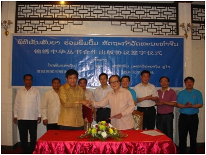 《中华锦绣丛书》由苏州大学出版社出版,系国家“十一五”图书出版规划项目,国家出版基金、经典中国国际出版工程资助项目,曾获中华优秀出版物奖图书提名奖。2011年5月,苏州大学出版社社长张建初访问老挝国家出版印刷公司期间,曾就《中华锦绣丛书》版权输出事宜与老挝国家出版印刷公司达成合作意向。近两年来,经过双方的共同努力,在校国际合作交流处、老挝苏州大学等相关部门领导的关心、支持下,丛书的英文版翻译工作进展顺利。丛书将在老挝国家出版印刷公司出版发行,这是苏大社成立以来首部实现版权对外输出的图书。