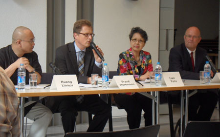 活动在德国驻华使馆欧洲厅举行。中心和国关学院的师生代表以及从事中德交流的各界人士约60人参加了本次活动。德国研究中心主任黄燎宇教授、汉堡联邦国防军大学国际政治系主任Michael Staack教授、北京外国语大学德语系刘立群教授与作者一道作为嘉宾出席会议。整场活动由新书介绍、嘉宾点评、听众提问几个环节组成。连玉如教授提出的中德“天然盟友”关系等论题引起热烈讨论。德国驻华使馆政治部副主任Frank Hartmann(夏德满)主持了会议。