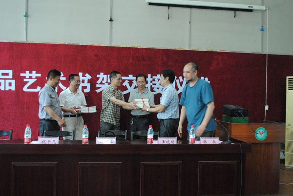 中国美院出版社祝平凡副社长在交接仪式上的致辞中表示,希望通过敦品书架将书香带入湖州一中,使读书的生活方式伴随学生终生,并成为他们将来安身立命的根本。校长钱月新向主办单位致谢,指出敦品艺术书架旨在令更广大学生接受艺术教育,承诺将敦品艺术书架作为传承和推动文化艺术的重要途径,认真地举办下去。会上,中国美术学院出版社向校方赠予“敦品艺术书架”牌匾和艺术书籍。此次捐赠的500册图书均为出版社历年出版的精品书籍,主要包括著名艺术家画册、美术理论专著、中国美术学院艺术创作以及创意设计成果等四部分。
